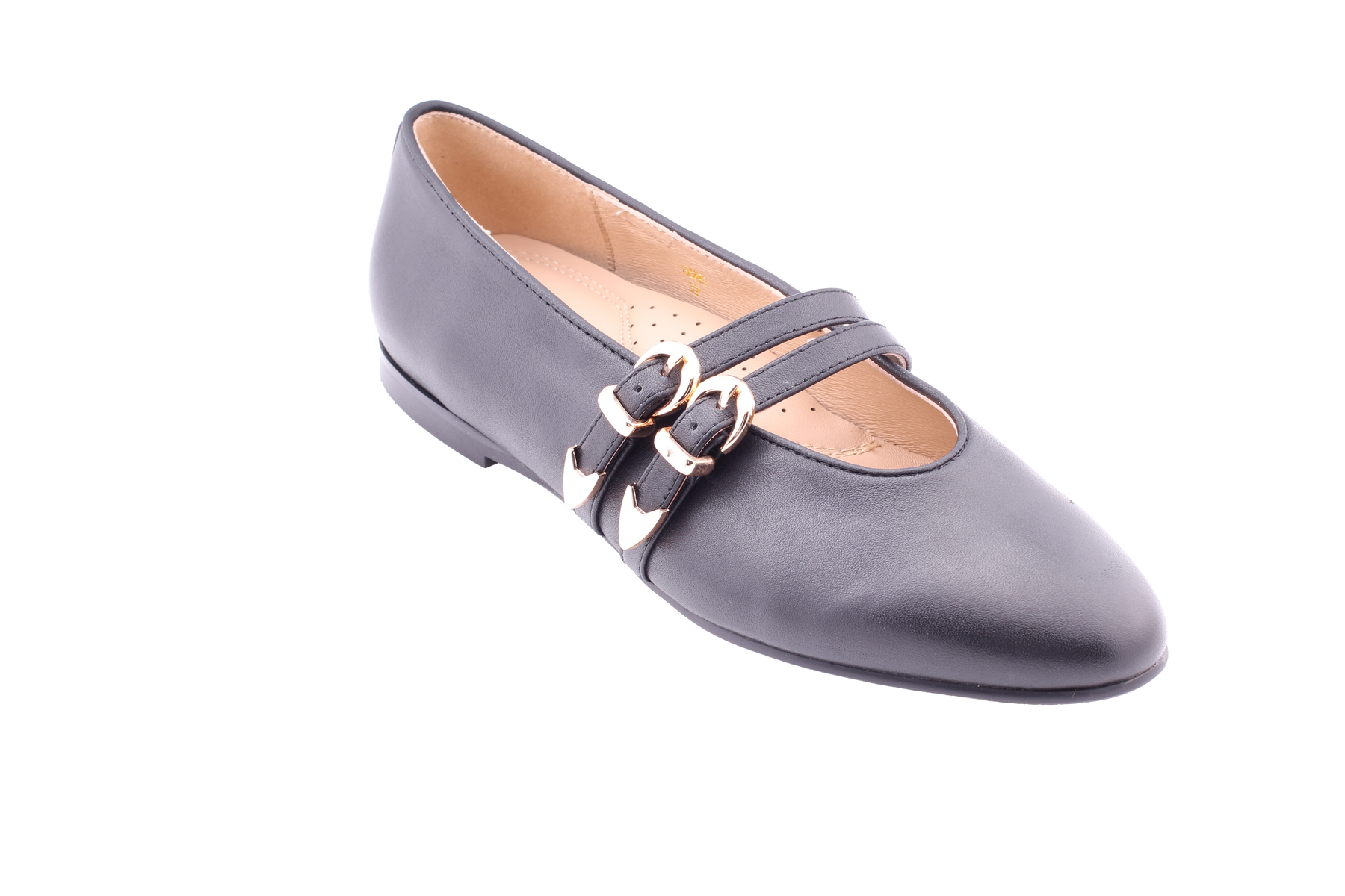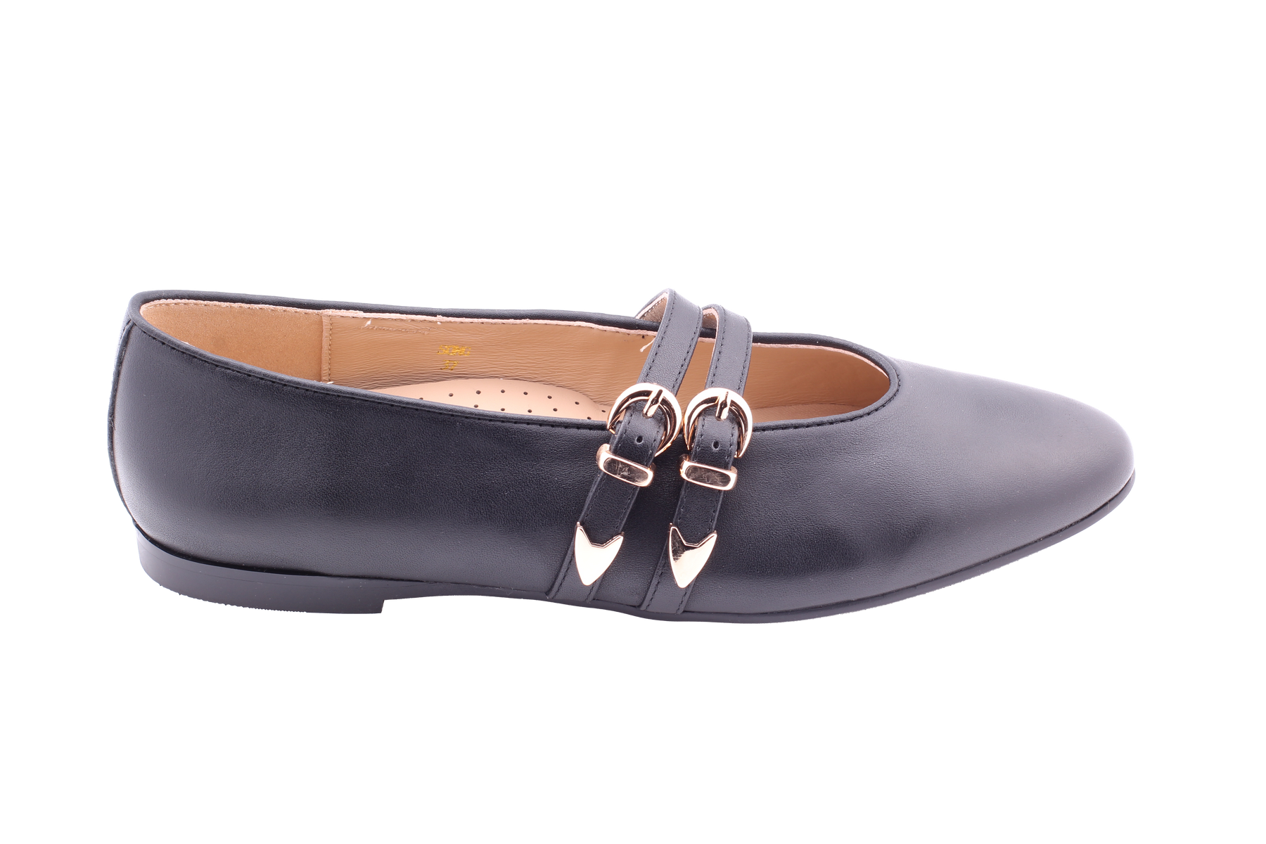 A sophisticated double strap Mary Jane. Beautiful gold buckle detailing make it the perfect pair for summer wear.